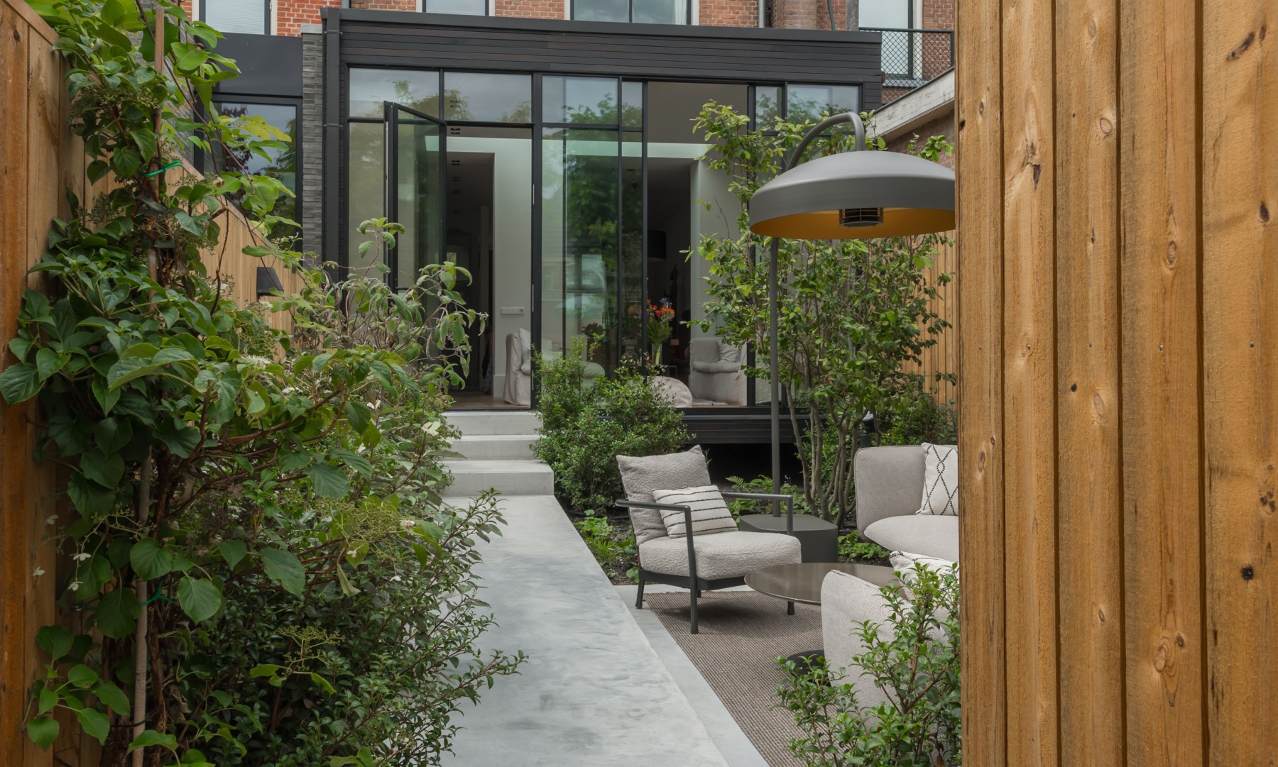 Following the renovation of this classic city-center building, the backyard was redesigned to complement the modern extension. A raised concrete catwalk serves as a floating element, connecting the different levels, including the terrace and storage area. The garden is framed by greenery, creating a sense of calm, cohesion, and a sheltered atmosphere.