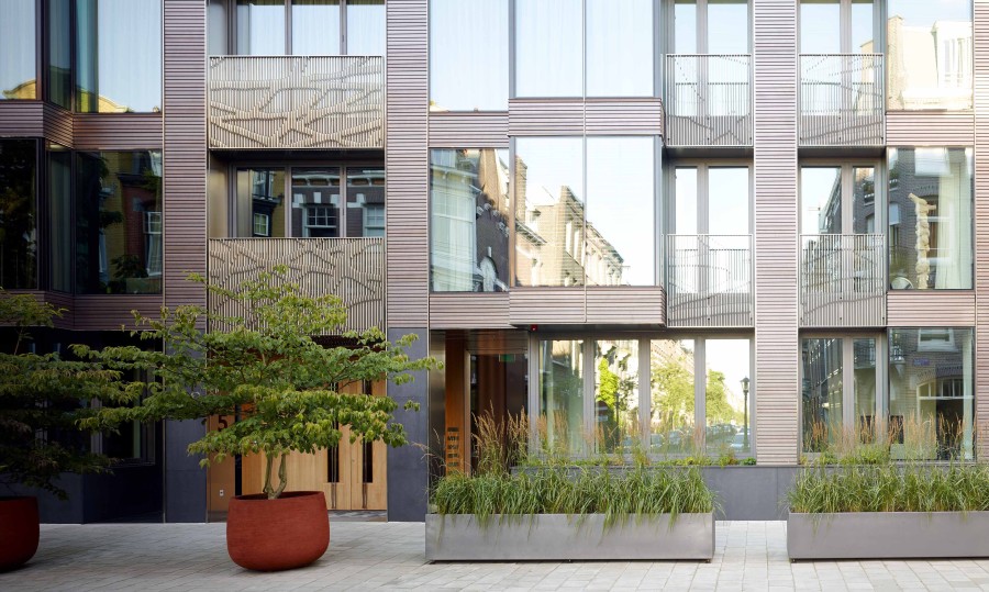 Voor dit luxe appartementencomplex is een ontwerp gemaakt dat parkeren ontmoedigt en tegelijkertijd de architectuur versterkt. De langwerpige plantenbakken zijn gecombineerd met twee karaktervolle Domani potten als eyecatchers bij de entree. De beplanting biedt privacy zonder het zicht volledig te ontnemen. In samenwerking met de opdrachtgever, de gemeente Amsterdam en Van Haneghem is een duurzaam en esthetisch resultaat gerealiseerd.