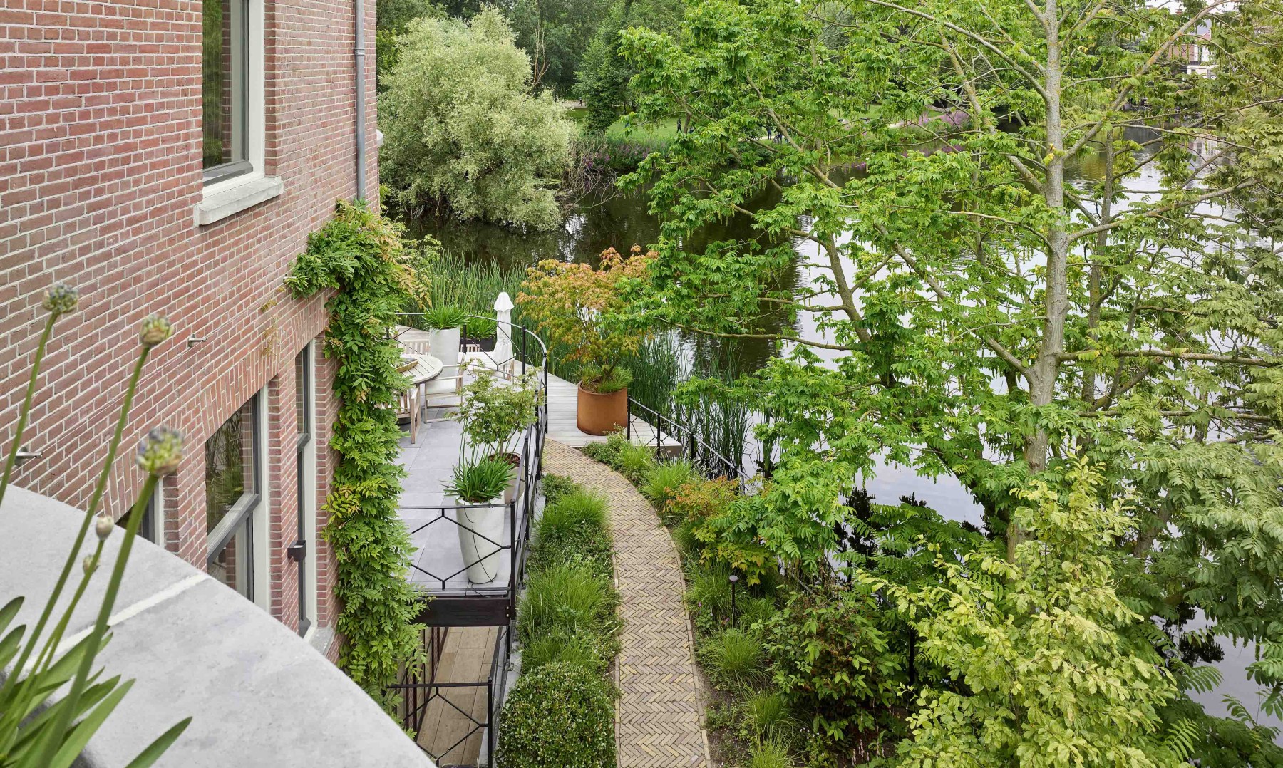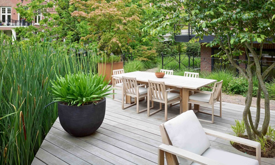 Deze stadstuin sluit zorgvuldig aan bij het historische pand en zijn omgeving. Door het behoud en slim inpassen van bestaande bomen ontstaat een weelderig en statig beeld. De tuin biedt zowel openheid als privacy en combineert authentieke materialen met een doordachte inrichting. Het terras en meubilair zijn in overleg met de opdrachtgever geselecteerd.